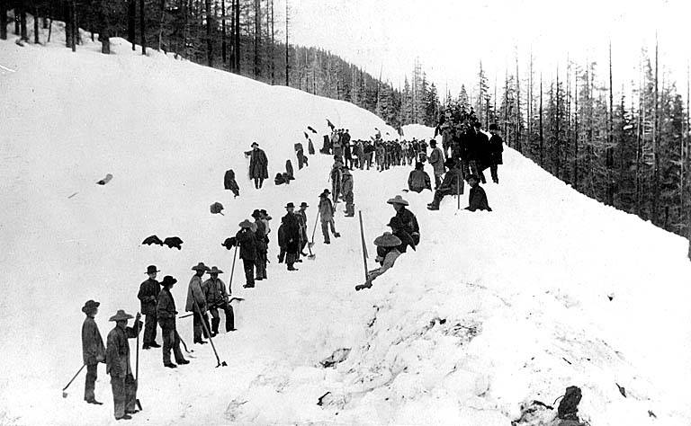a group of Chinese coolies on the switchback near the summit of the Cascades, in 1886. Possibly on the tracks of the Northern Pacific Railroad - courtesy of UW Libraries Special Collections