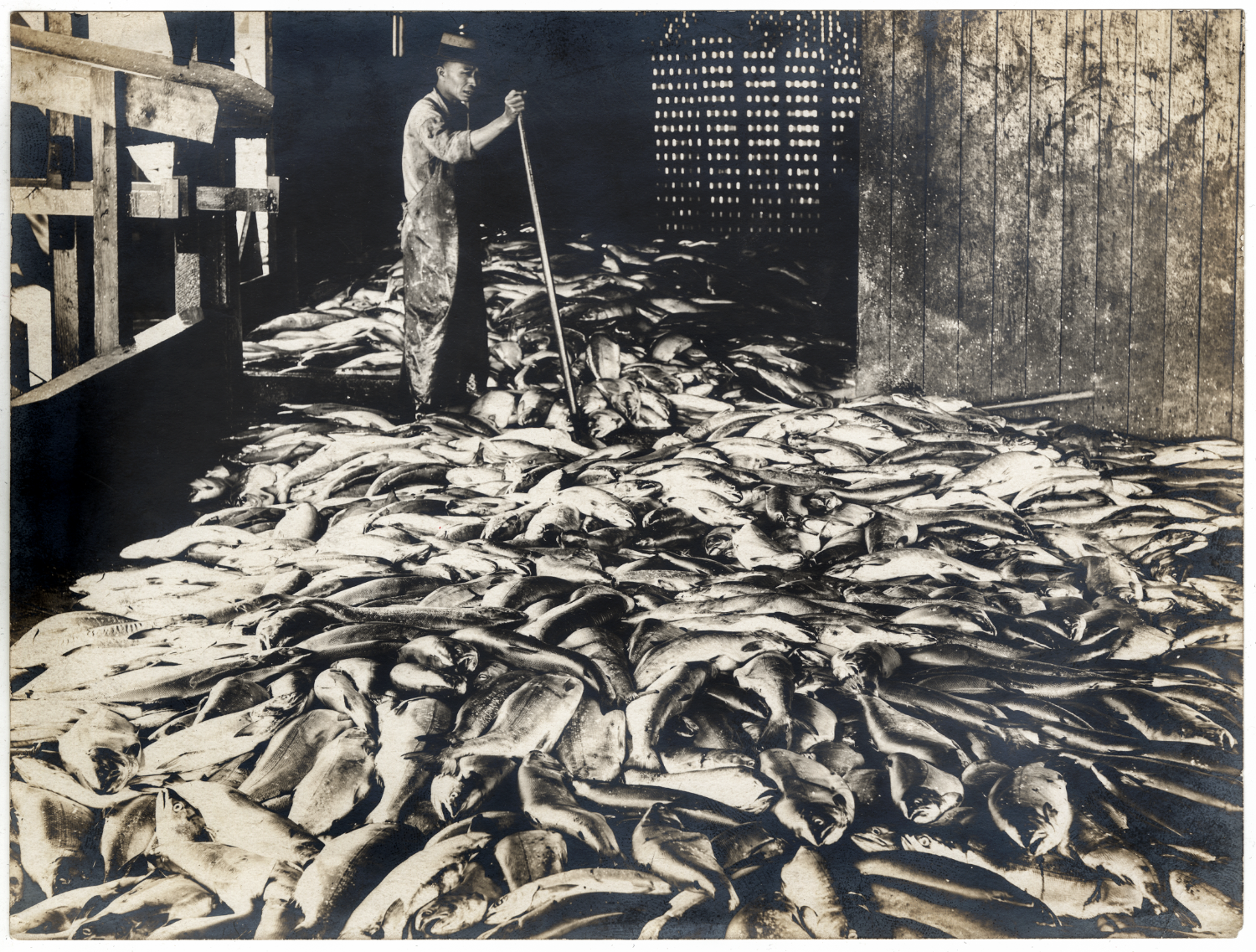 Chinese worker in Seattle cannery with fish - courtesy of Museum of History & Industry, Seattle.