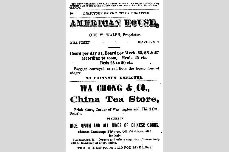 Advertisements from the Seattle City Directory of 1879 for American House and Wa Chong and Co. Courtesy of University of Washington Libraries, Special Collections, SOC0003