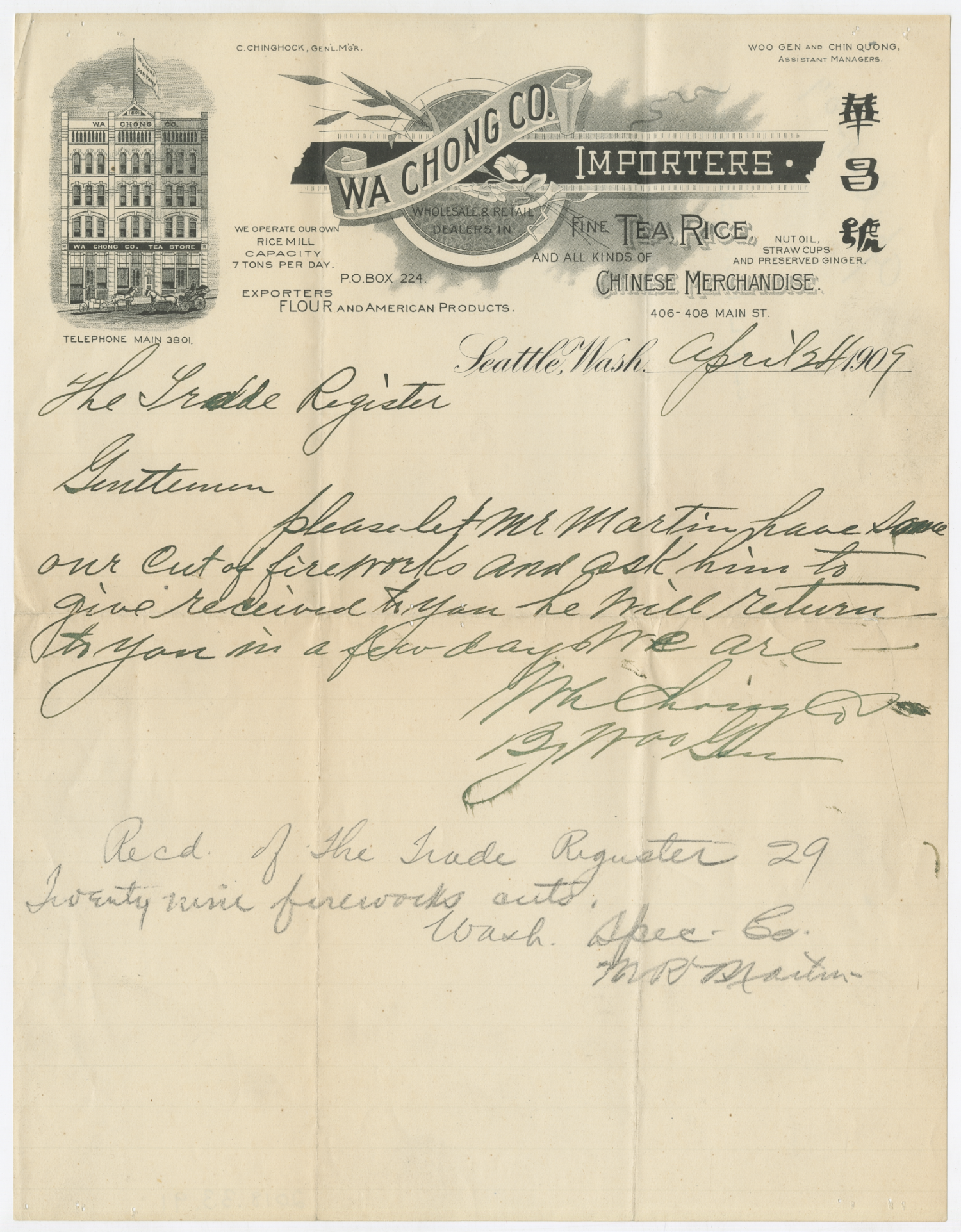 Handwritten on letterhead: ‘Seattle Trade Register // Gentlemen, Please let Mr. Martin have our cut of fireworks and ask him to give received to you, he will return to you in a few days. // We are Wa Chong Co., By Woo Gen’ - courtesy of Museum of History & Industry, Seattle.