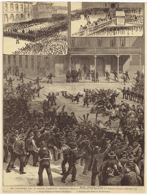 Almost 140 years ago, Seattle’s Chinese population was almost completely forcibly expelled. During 1885-1886 there were two forces competing against each other; not on whether to keep or remove the Chinese, but on how to best remove the Chinese from Seattle. Although racial tension between white Americans and Chinese workers was always present it escalated in the 80s; the United States was heading into a recession causing widespread unemployment and the Chinese were a convenient target to blame for the declining economic situations. The first and larger of the two groups were the sinophobes or the “anti-Chinese”. They were composed of working class men and led by the Knights of Labor. The Knights of Labor were a major labor organization and also primarily responsible for the expulsion of the Chinese population in Tacoma only a year prior. Their violent but successful approach on expelling out the Chinese became known as the Tacoma method and it would also be successfully executed in Anacortes and Port Townsend. Labor organizations and white laborers in particular had a growing hate for Chinese works as they were used as an alternative to relatively more expensive white labor. The other of the two groups were the “law and order” group. Made up of city officials and other prominent figures, the law and order group sought to remove the Chinese by way of the law. By this time the federal government had already passed the Chinese Exclusion Act in 1882 which prohibited Chinese laborers from coming into the United States. Although their violence was tempered their racist and xenophobic intent was the same as the sinophobes.